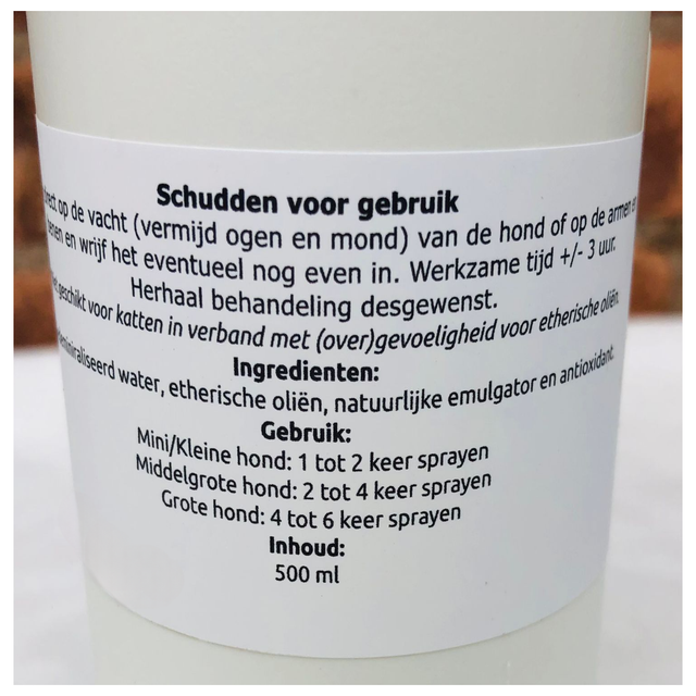 * Deze spray is naast direct op de vacht ook geschikt om te gebruiken in combinatie met de halsband met lavastenen (spray op de lavastenen, 10 minuten laten drogen en dan omdoen bij de hond).