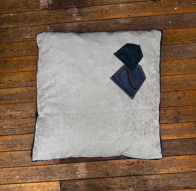 Het kussen is gemaakt van spijkerbroeken en allerlei reststoffen, het binnenkussen is gevuld met polyether schuimvlokken welke door fabrikanten als restmateriaal wordt gezien.
