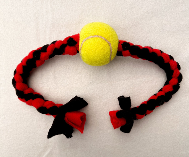 Het trektouw is gemaakt van restanten fleece en tennisballen die door de tennisbaan als afgeschreven worden beschouwd en verkocht worden en waarvan de opbrengst naar Stichting Dierenlot gaat!
