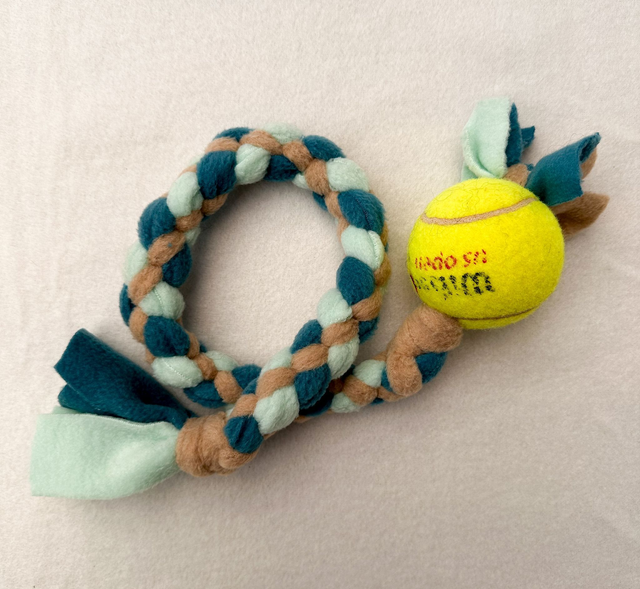 Het trektouw is gemaakt van restanten fleece en tennisballen die door de tennisbaan als afgeschreven worden beschouwd en verkocht worden en waarvan de opbrengst naar Stichting Dierenlot gaat!
